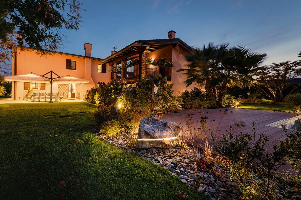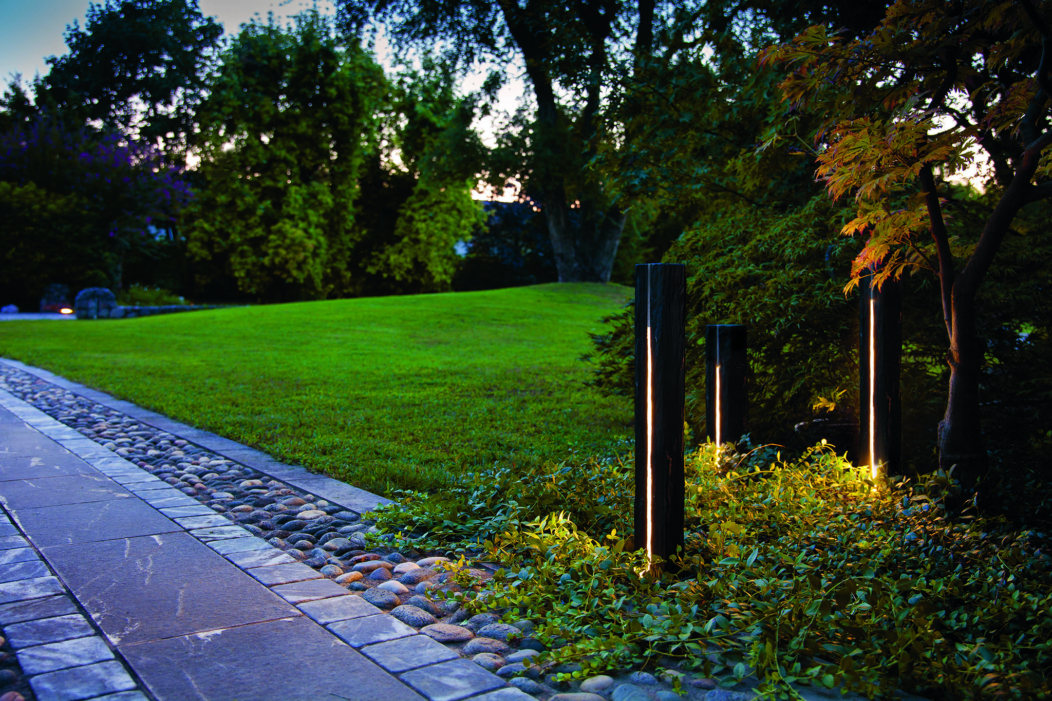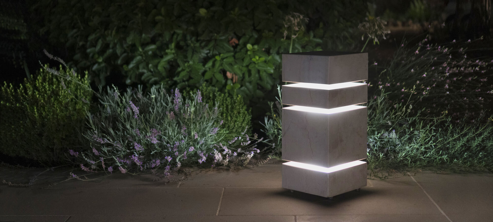 Sculpturale objecten in natuursteen waar LED-licht op discreet wijze sfeer aan buitenruimtes geeft.